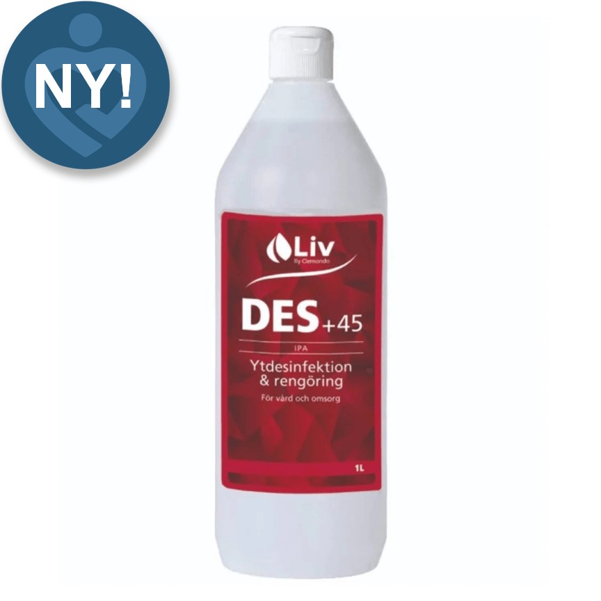 Liv Des +45 är en isopropanolbaserad ytdesinfektion som kombinerar desinficerande och rengörande effekt. Produkten är utvecklad för miljöer där det är avgörande att förebygga mikrobiologisk smittspridning, såsom inom vård och omsorg, veterinärverksamhet, laboratorier, livsmedelsindustri samt liknande verksamheter.